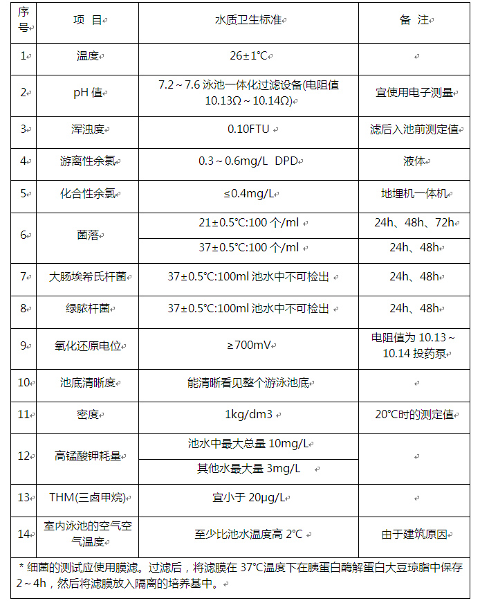 國際游泳協會(FINA)關于游泳池池水水質衛生標準的規定: