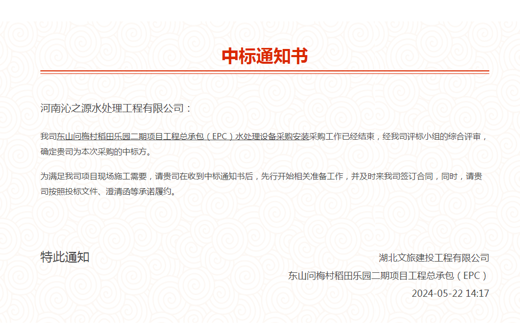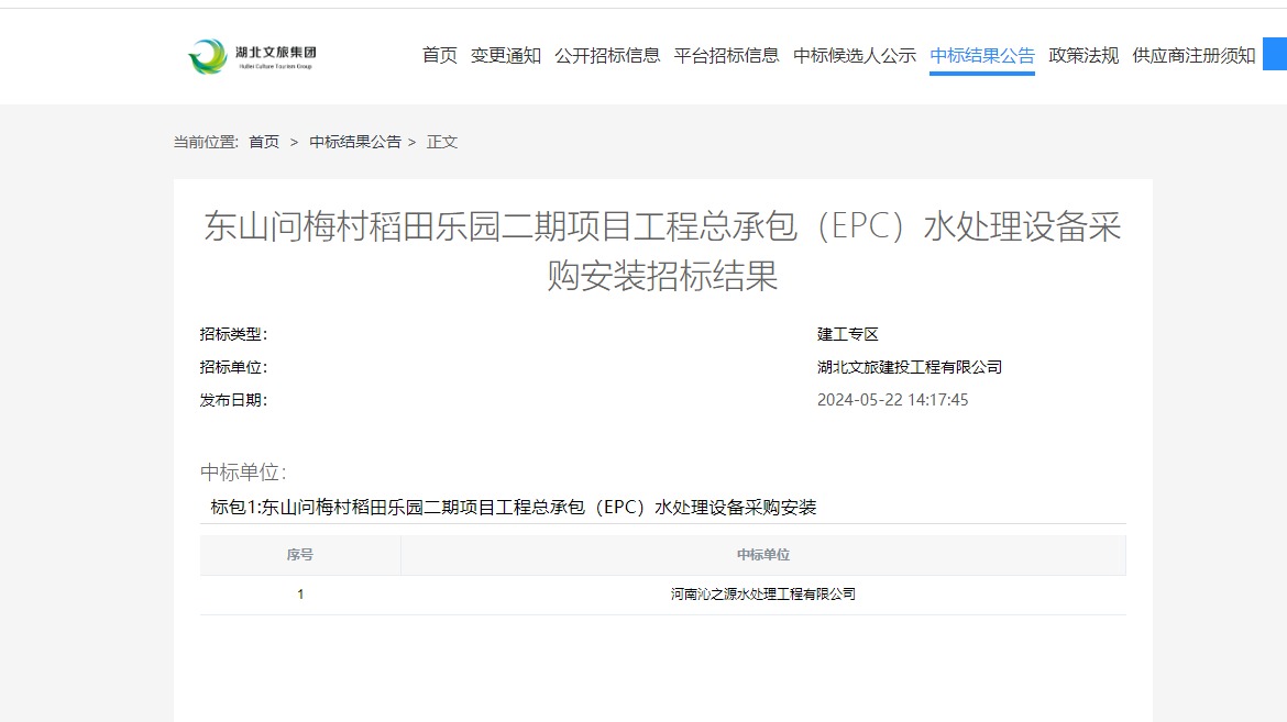 我司中標湖北文旅東山問梅村稻田樂園二期項目工程總承包(EPC)水處理設備采購安裝項目。我司將積極配合項目進展以高標準、高品質完成設備安裝工作。