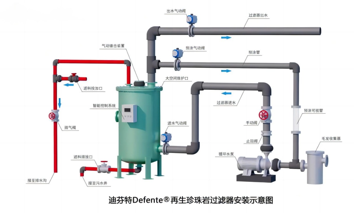 砂缸通過砂床截留過濾池水中的顆粒物。當(dāng)砂床變臟/負(fù)荷增大時,必須進(jìn)行反沖洗過程,恢復(fù)設(shè)計循環(huán)流量,在反沖洗過程中大量的水被排放掉,這是一筆極大的運(yùn)行費(fèi)用。再生介質(zhì)過濾器在涂有珍珠巖介質(zhì)的軟管表面捕集顆粒。當(dāng)珍珠巖濾料截留的顆粒物增加到一定程度時,再生介質(zhì)過濾器通過“撞擊”將濾料從濾管表面脫落,然后自動進(jìn)入預(yù)涂過程,將濾料重新附著在過濾管的表面進(jìn)行正常的過濾循環(huán)過程。如此往復(fù)多次,直到缸體內(nèi)濾料的吸附能力完全耗盡,將濾料排放出缸體,重新放入新的濾料。使用過程完全沒有反沖洗的過程,節(jié)省了大量的用水!