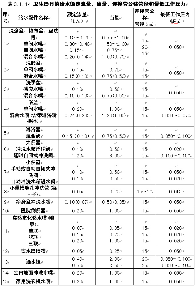 表3.1.14 衛(wèi)生器具的給水額定流量、當(dāng)量、連接管公稱管徑和工作壓力