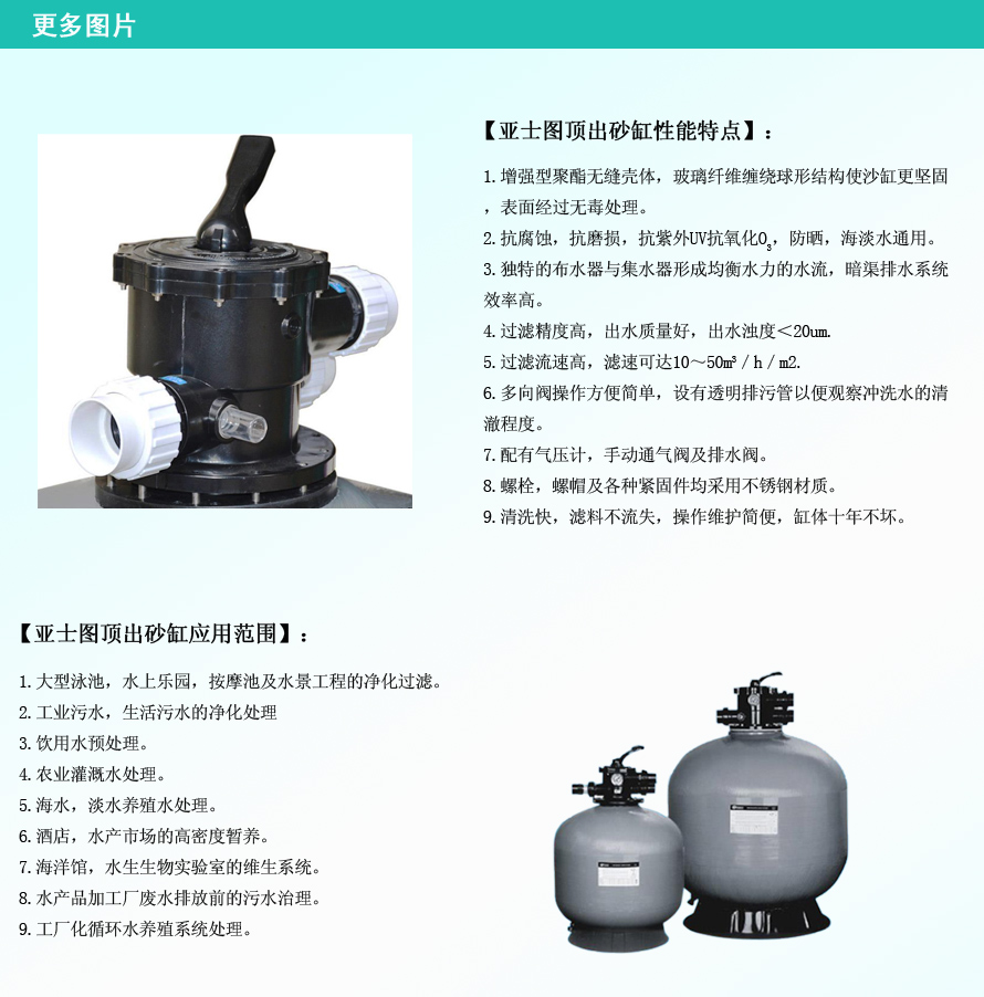 本款為亞士圖頂式砂缸,也叫亞士圖頂出式砂缸過濾器,采用增強(qiáng)型聚酯無縫殼體,表面由玻璃纖維纏繞球形結(jié)構(gòu),使砂缸更堅固穩(wěn)定,而且表面經(jīng)過無毒處理,使用安全放心。本砂缸抗腐蝕,抗磨損,抗紫外UV,抗氧化,防曬,海淡水通用。因此泳池,景觀池,桑拿,浴池等均可使用。