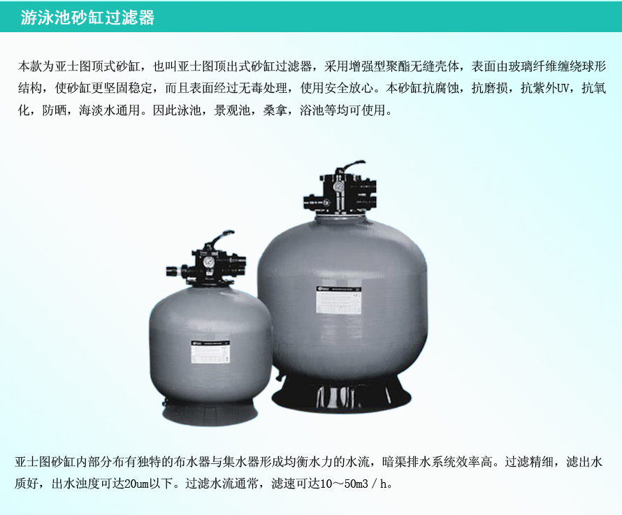 主要用于各類游泳池,水上樂園,按摩池及水景工程的凈化過濾。規(guī)格有多種可選,具體可根據(jù)泳池的大小和流速來確定合適大小和數(shù)量的砂缸設(shè)備。