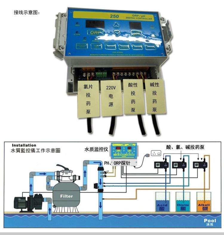水質(zhì)在線監(jiān)測儀250#,是一款可以在線監(jiān)測水質(zhì)的檢測儀器,主要用于游泳池進行水質(zhì)檢測。可以在線監(jiān)測泳池的pH,ORP值。