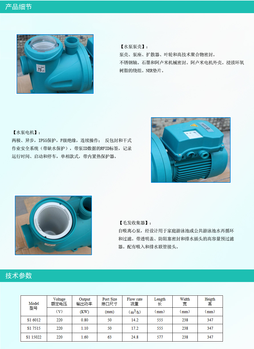 泳池循環(huán)水泵電機:兩極、異步,IP55保護,F(xiàn)級絕緣,連續(xù)操作; 反包封和干式作業(yè)安全系統(tǒng)(帶缺水保護),帶泵ID數(shù)據(jù)的RFID標(biāo)簽,記錄運行時間、啟動和停車,單相款式,帶內(nèi)置熱保護器。