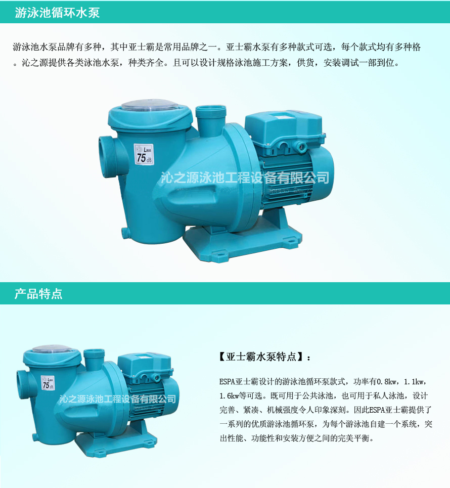 游泳池水泵品牌有多種,其中亞士霸是常用品牌之一。亞士霸水泵有多種款式可選,每個款式均有多種規(guī)格。沁之源提供各類泳池水泵,種類齊全。且可以設(shè)計規(guī)格泳池施工方案,供貨,安裝調(diào)試一部到位。