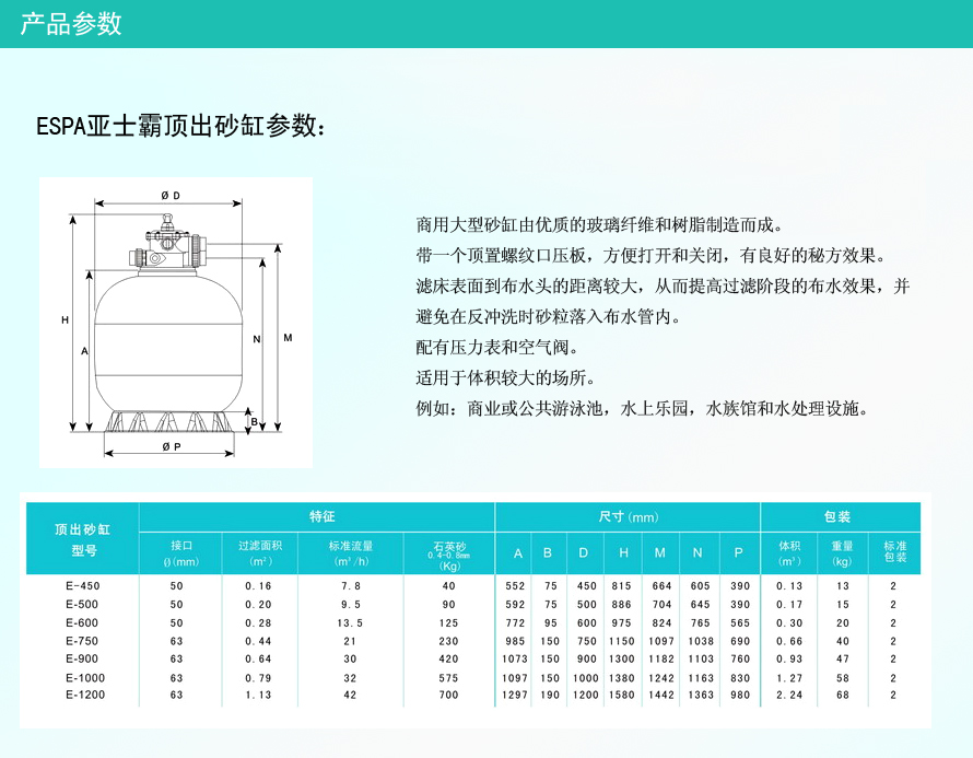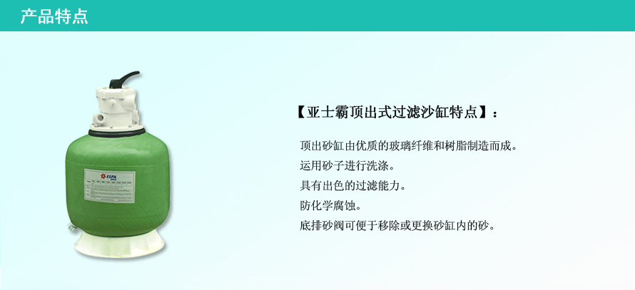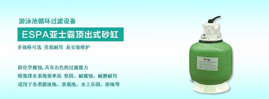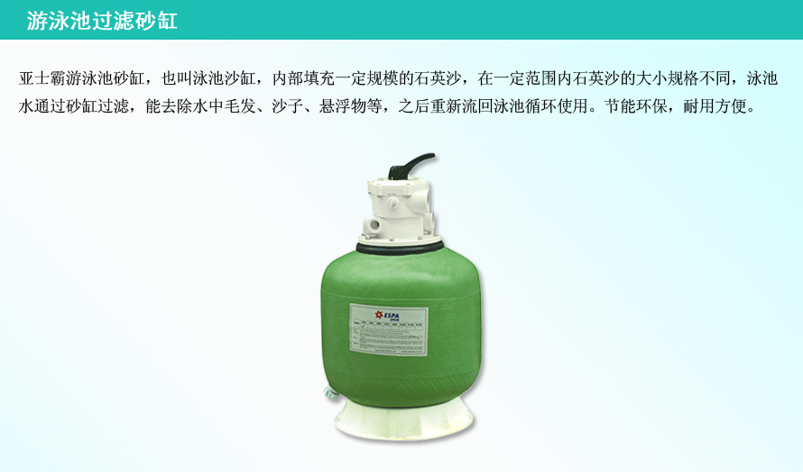 ??? 亞士霸游泳池砂缸,也叫泳池沙缸,內部填充一定規模的石英沙,在一定范圍內石英沙的大小規格不同,泳池水通過砂缸過濾,能去除水中毛發、沙子、懸浮物等使水變清澈,之后重新流回泳池循環使用。節能環保,耐用方便。