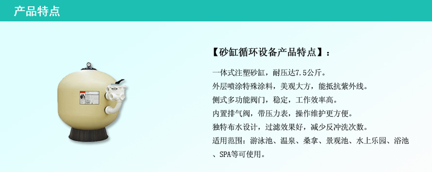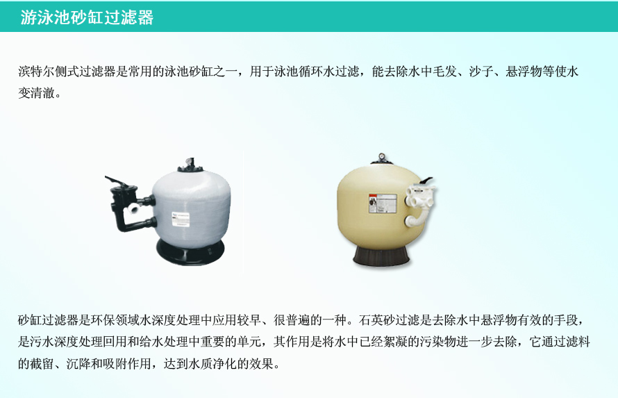 ??? 濱特爾頂側(cè)式過(guò)濾器是常用的泳池砂缸之一,用于泳池循環(huán)水過(guò)濾,能去除水中毛發(fā)、沙子、懸浮物等使水變清澈。